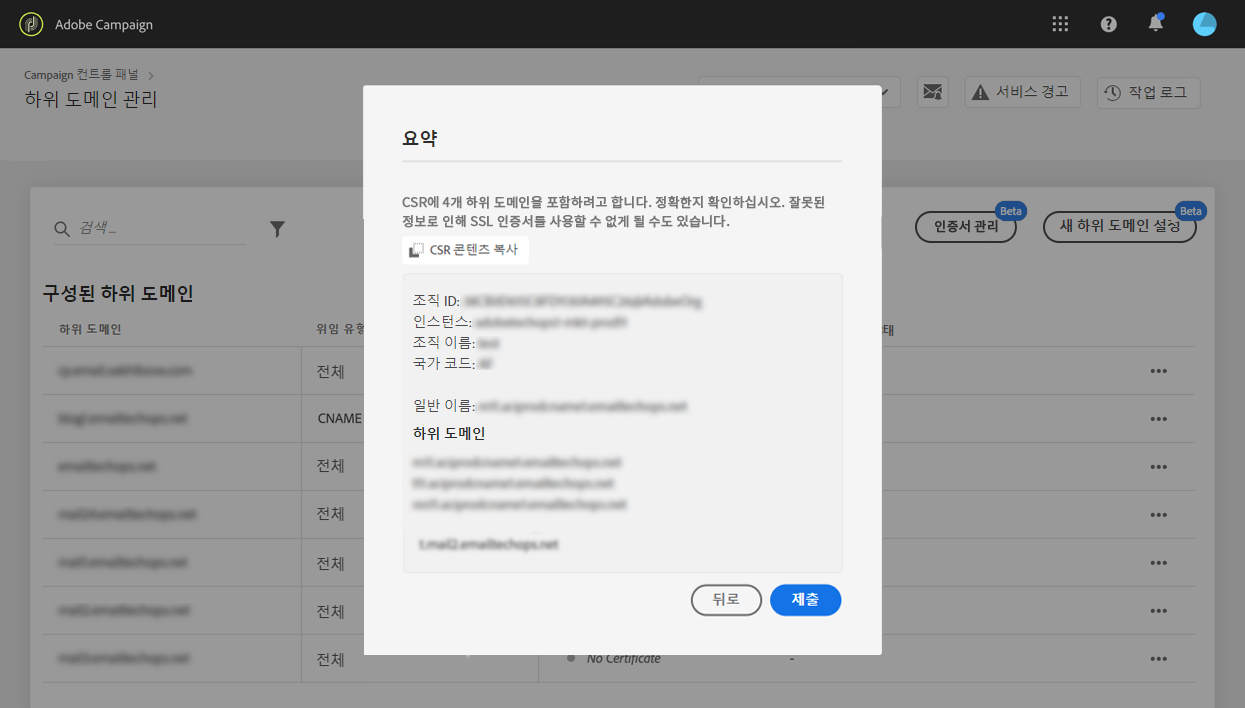 다음 Copy CSR content 버튼을 사용하면 CSR(조직 ID, 인스턴스, 조직 이름, 일반 이름, 포함된 하위 도메인 등)과 관련된 모든 정보를 복사할 수 있습니다.