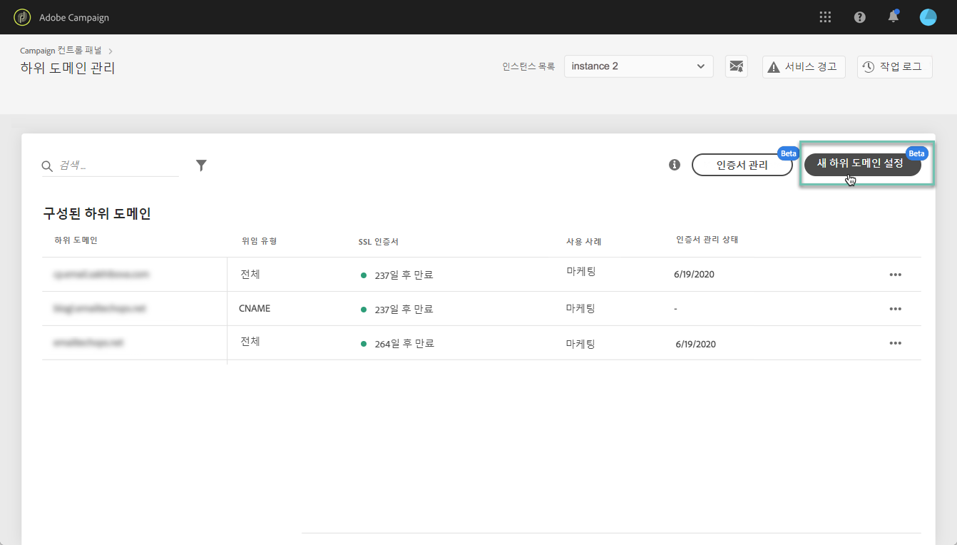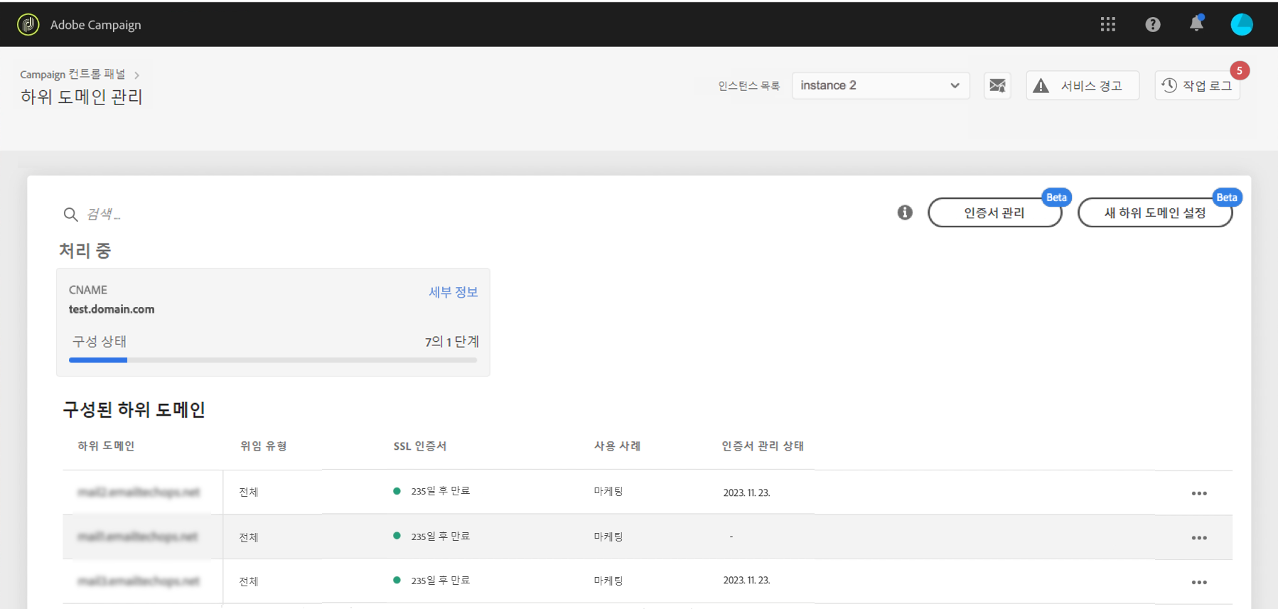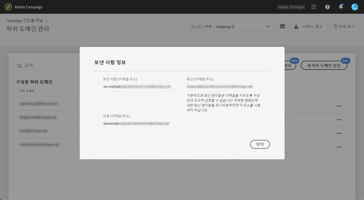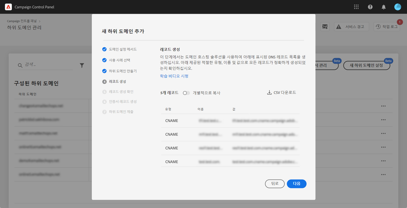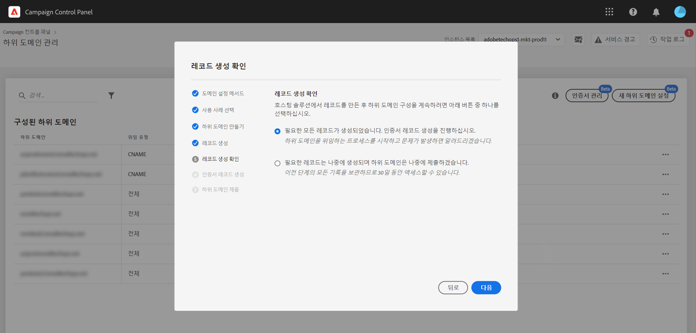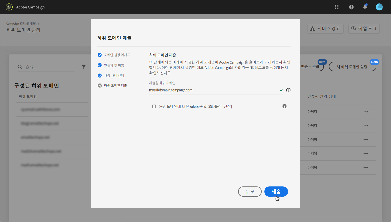 하위 도메인을 제출하면 Campaign 컨트롤 패널에서 다양한 검사 및 구성 단계를 수행합니다. 자세한 내용은 하위 도메인 확인 및 구성을 참조하십시오.