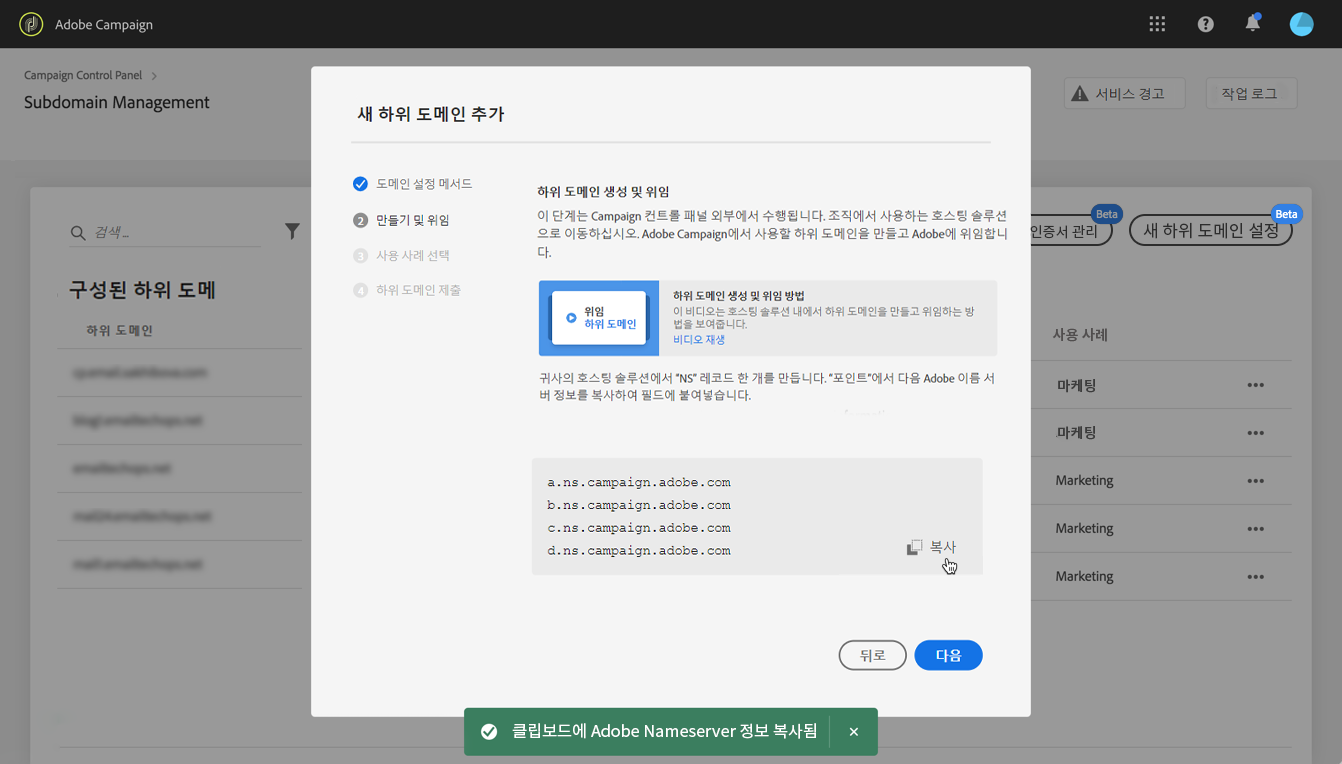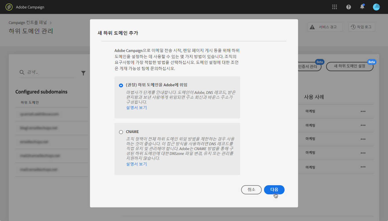 하위 도메인을 Adobe Campaign에 완전히 위임하려면 아래 단계를 따르십시오.