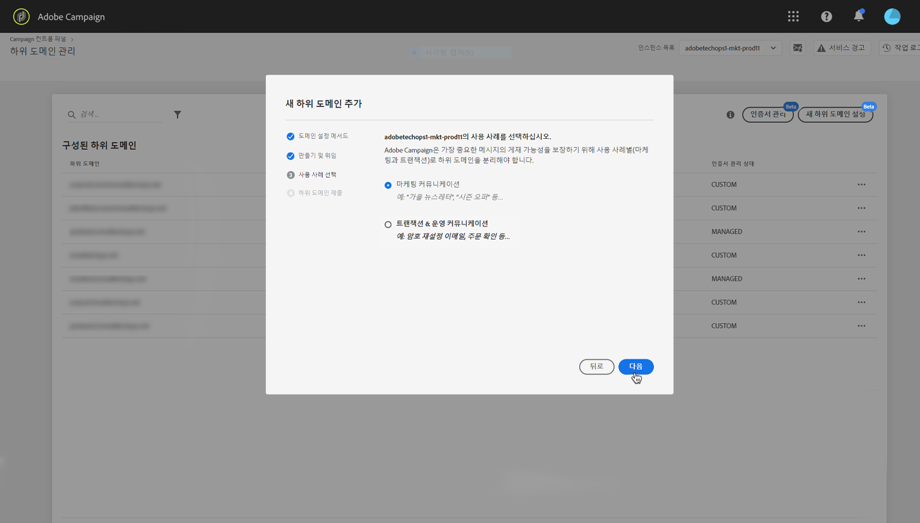 Campaign v7/v8 인스턴스를 선택한 경우 하위 도메인에 대해 원하는 사용 사례를 선택합니다. 마케팅 커뮤니케이션 또는 트랜잭션 및 운영 커뮤니케이션. 하위 도메인의 사용 사례에 대한 전체 개념은 이 섹션에서 살펴볼 수 있습니다.