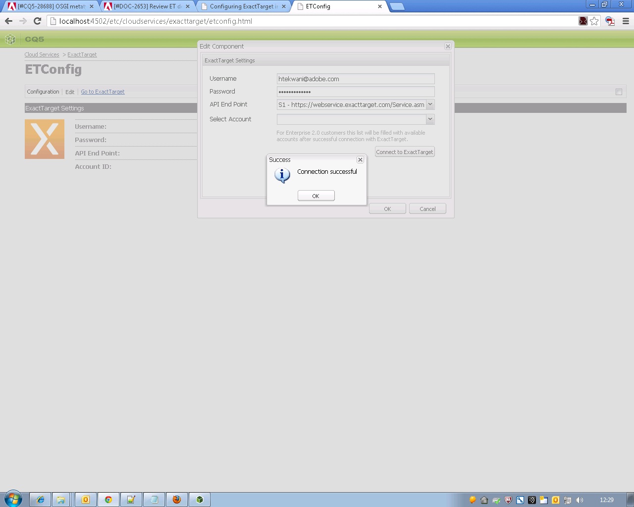 单击 连接到ExactTarget。 成功连接后,您会看到一个成功对话框。 单击 确定 以退出窗口。