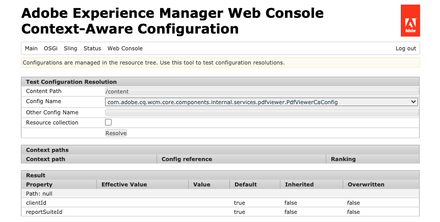 For debugging and testing purposes, there is a Context-Aware Configuration web console at https://<host>:<port>/system/console/slingcaconfig, which allows querying context-aware configurations in the repository and viewing their properties.