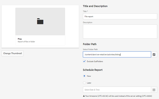 Configureer rapportdetails zoals titel, beschrijving, miniatuur, mappad en datumbereik.