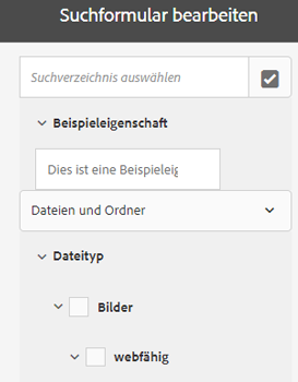 Die Suchfacetten, die im Bedienfeld „Filter“ angezeigt werden, werden im zugrunde liegenden Suchformular mithilfe von Prädikaten definiert. Um weitere oder andere Facetten anzuzeigen, fügen Sie dem standardmäßigen Formular Prädikate hinzu oder verwenden Sie ein benutzerdefiniertes Formular, das Facetten Ihrer Wahl enthält.