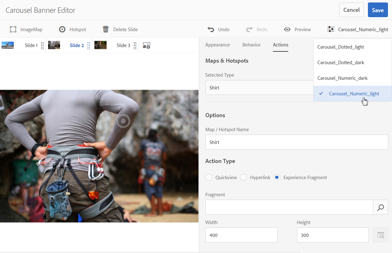 Voeg een of meer hotspots of afbeeldingen met hyperlinks toe aan een afbeeldingsbanner en koppel deze aan een actie zoals een koppeling, een Snelle weergave of een Experience-fragment. Nadat u hotspots of afbeeldingen met hyperlinks hebt toegevoegd, kunt u deze taak voltooien door de carrouselset te publiceren. Met Publiceren maakt u de insluitcode die u kunt gebruiken om de bestemmingspagina van uw website te kopiëren en toe te passen.