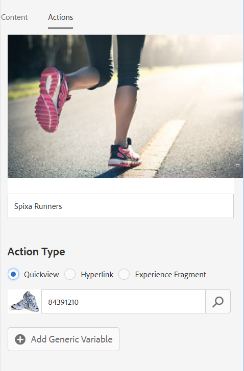 Dans le cas le plus simple, la seule partie variable dans l’URL de l’aperçu rapide est le SKU du produit. Dans ce cas, la valeur de SKU du produit est la seule donnée requise pour ajouter des vignettes sur un segment temporel dans la vidéo interactive dans Experience Manager.