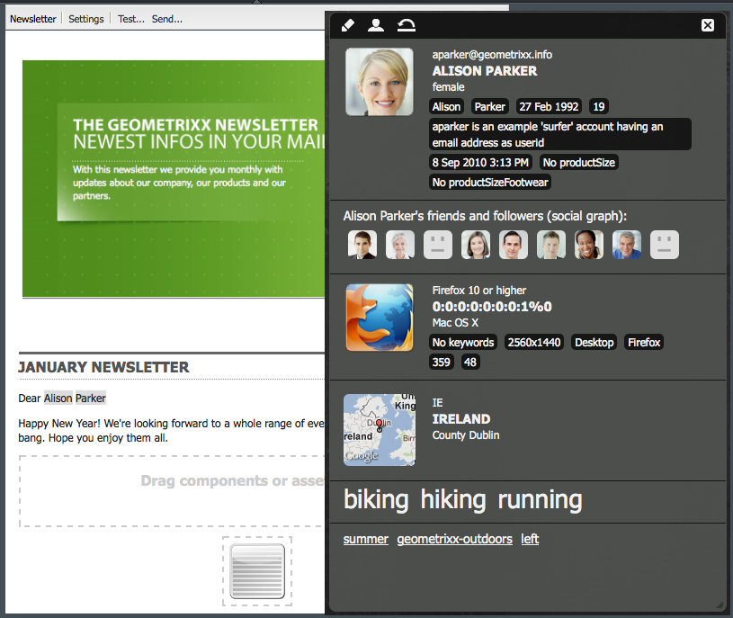 您可以在電子報的Text元件中插入預先定義的變數,以個人化電子報Geometrixx。 變數的值繼承自使用者設定檔中的資訊。