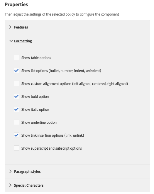 Los componentes principales permiten a un autor de plantillas configurar qué propiedades están disponibles para los autores de la página. Estas incluyen funciones como fuentes de pegado permitidas, opciones de formato, estilos de párrafo disponibles, etc.