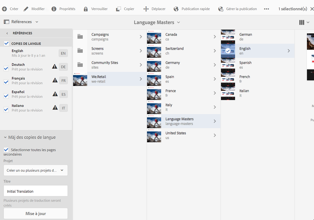 7. Cochez la case en regard de l’option Copies de langue libellé pour sélectionner toutes les copies de langue. Dans le Mise à jour des copies de langue de la section , sélectionnez l’option pour Création d’un projet de traduction. Attribuez un nom au projet et cliquez sur Mettre à jour.