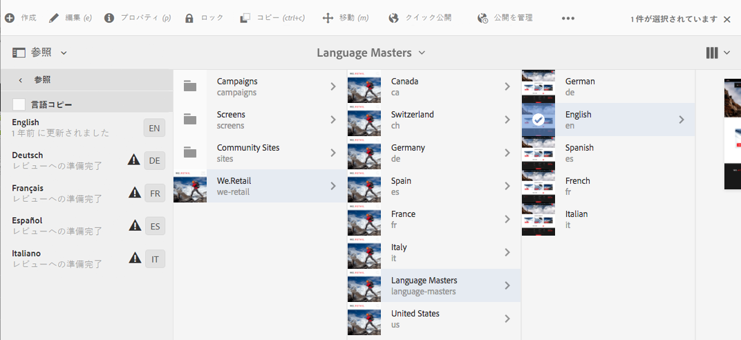 列表示に切り替えて(まだアクティブでない場合)、We.Retail を選択します。 サンプルの国の構造には、言語マスターに加えてスイス、アメリカ、フランスなどが含まれています。