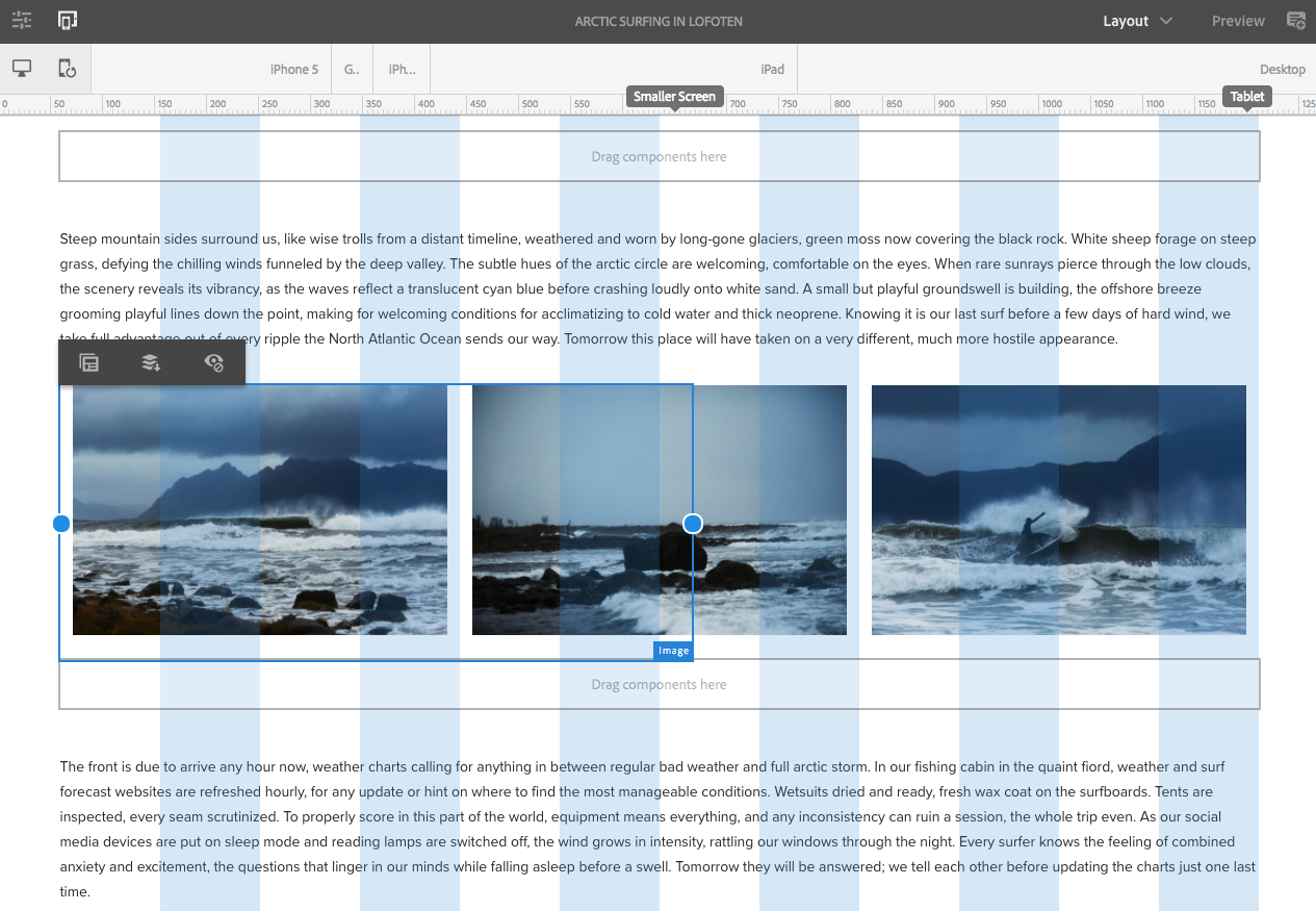 Todas as páginas We.Retail usam o componente Contêiner de layout para implementar um design responsivo. O contêiner de layout fornece um sistema de parágrafo que permite posicionar os componentes dentro de uma grade responsiva. Essa grade pode reorganizar o layout de acordo com o dispositivo/tamanho e formato da janela. O componente é usado junto com a variável Layout no editor de páginas, que permite criar e editar seu layout responsivo dependendo do dispositivo.