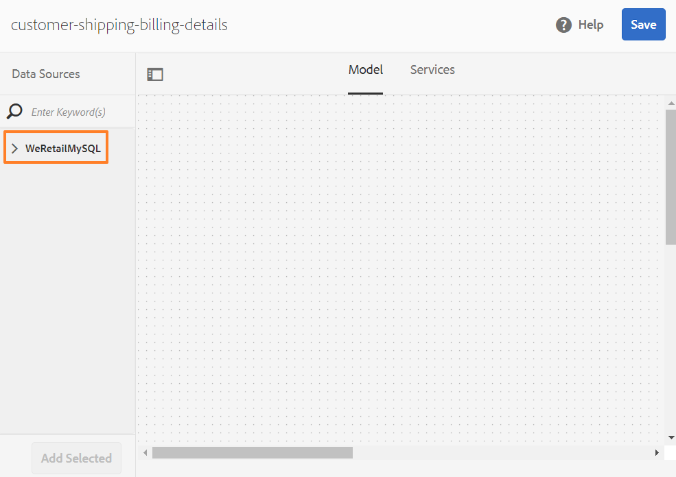 AEM Forms provides an intuitive user interface to create a form data model from configured data sources. You can use multiple data sources in a form data model. For our use case, we will use the configured MySQL data source.