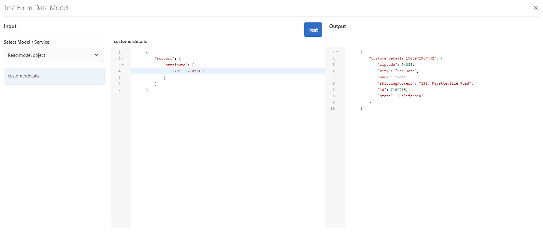 Go to the Model tab, select the customerdetails data model object, and tap Test Model Object.