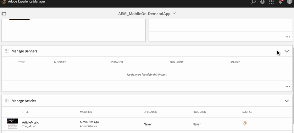 Essa operação exclui o banner selecionado do Mobile On-Demand e, opcionalmente, da instância de AEM local.