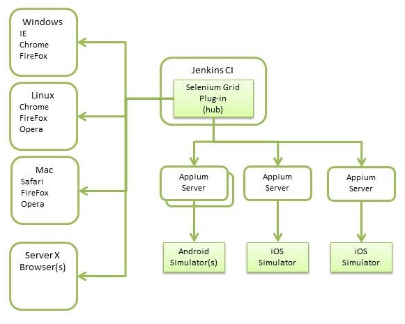 Deve ser realizado algum grau de teste automatizado para abranger a variedade de tamanhos de tela, restrições de memória, métodos de entrada e sistemas operacionais. Ela não só abrange grande parte dos casos de teste, como também pode acelerar o teste de regressão quando novos recursos ou dispositivos são introduzidos. Idealmente, suas ferramentas de automação devem reduzir ou limitar a duplicação de esforços. Use ferramentas ou estruturas para que seu esforço de teste seja aplicável em todas as plataformas. O gráfico a seguir mostra uma estrutura simplificada de um ambiente de teste para testes de interface de usuário com base na Web e testes de aplicativos móveis. O lado esquerdo do gráfico mostra uma série de nós do Selenium com navegadores. O SeleniumGrid pode realizar testes comuns de interface baseados na Web para qualquer um desses nós. O hub Selenium também pode se conectar ao Appum para testes de aplicativos em várias plataformas. Apenas são mostrados simuladores, mas você pode incorporar adb, para Android e utilitários Xcode para dispositivos iOS. Os links são fornecidos posteriormente neste documento, onde você pode encontrar detalhes específicos para as ferramentas mencionadas.