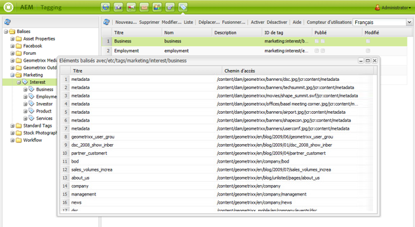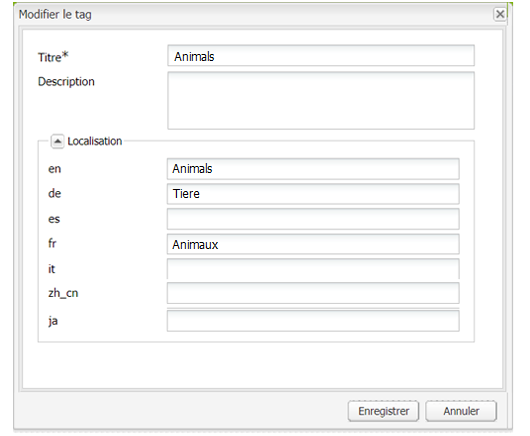La console Balisage utilise la langue du créateur, dès lors, pour la balise « Animals », « Animaux » s’affiche si l’utilisateur définit la langue sur Français dans les propriétés de l’utilisateur.