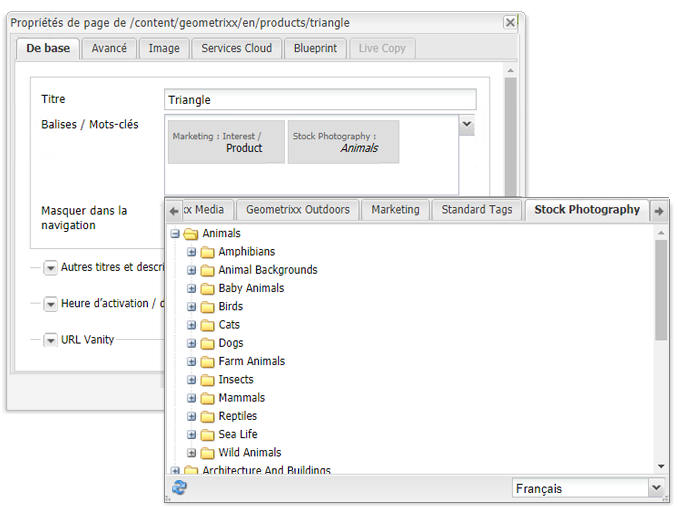 Le nuage de balises et les méta-mots-clés dans le composant de page standard utilisent la balise localisée . titlesselon la langue de la page, le cas échéant.