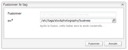 Il est également possible de recourir à la fusion de balises lorsqu’une taxonomie comporte des doublons. Lorsque la balise A est fusionnée dans la balise B, toutes les pages balisées avec la balise A sont balisées avec la balise B, et la balise A n’est plus disponible pour les auteurs.