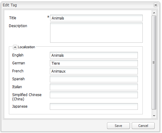다음 절차에서는 Animals 태그의 title을 영어, 독일어 및 프랑스어로 변환하는 방법을 보여 줍니다.