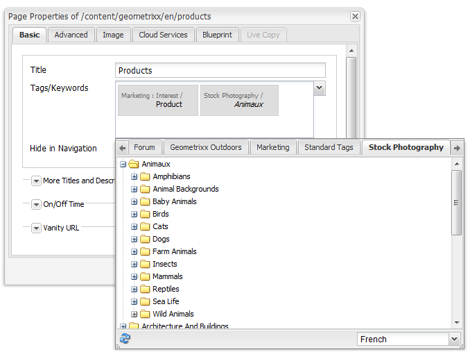 기본적으로 페이지 속성의 태그 titles이 페이지 언어로 표시됩니다. 페이지 속성의 태그 대화 상자에는 다른 언어로 titles 태그를 표시할 수 있는 언어 필드가 있습니다. 다음 절차에서는 titles 태그를 프랑스어로 표시하는 방법을 설명합니다.
