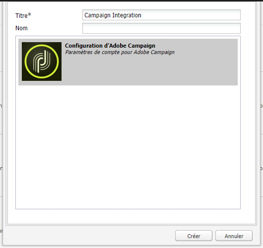 Créez une configuration en saisissant une Titre et cliquez sur Créer ou sélectionnez la configuration existante à lier à votre instance Adobe Campaign.