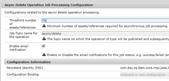 AEM で特定の操作を非同期で処理するように、アセット、ページまたは参照のしきい値を設定し、ジョブの処理時のメール通知を切り替えることができます。