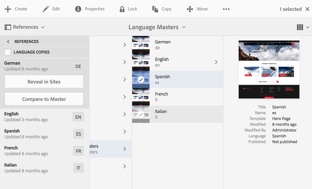 Se una pagina di origine già tradotta deve essere rinominata o spostata, la traduzione della pagina verrà ripetuta dopo lo spostamento e verrà creata una copia per lingua basata sul nuovo nome/percorso della pagina. La copia per lingua precedente basata sul nome/posizione precedente è ancora presente. Per evitare questo problema, è possibile utilizzare la funzionalità di aggiornamento della copia per lingua dopo lo spostamento: