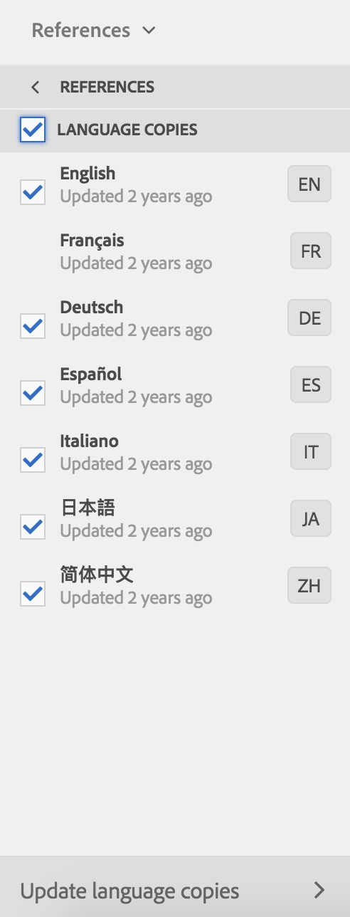 Il pannello Riferimenti indica se si stanno aggiornando le copie per lingua esistenti o se si sta creando la prima versione delle copie per lingua. Quando esiste una copia per lingua della pagina selezionata, viene visualizzata la scheda Aggiorna copie per lingua per consentire l’accesso ai comandi relativi al progetto.