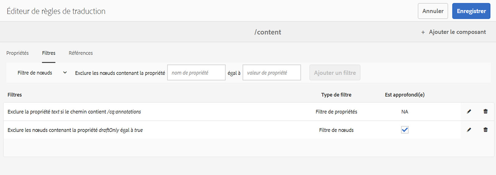 Par exemple, les règles suivantes entraînent la traduction de tout le contenu des propriétés text, à l’exception des nœuds dont la propriété draft est définie sur true.
