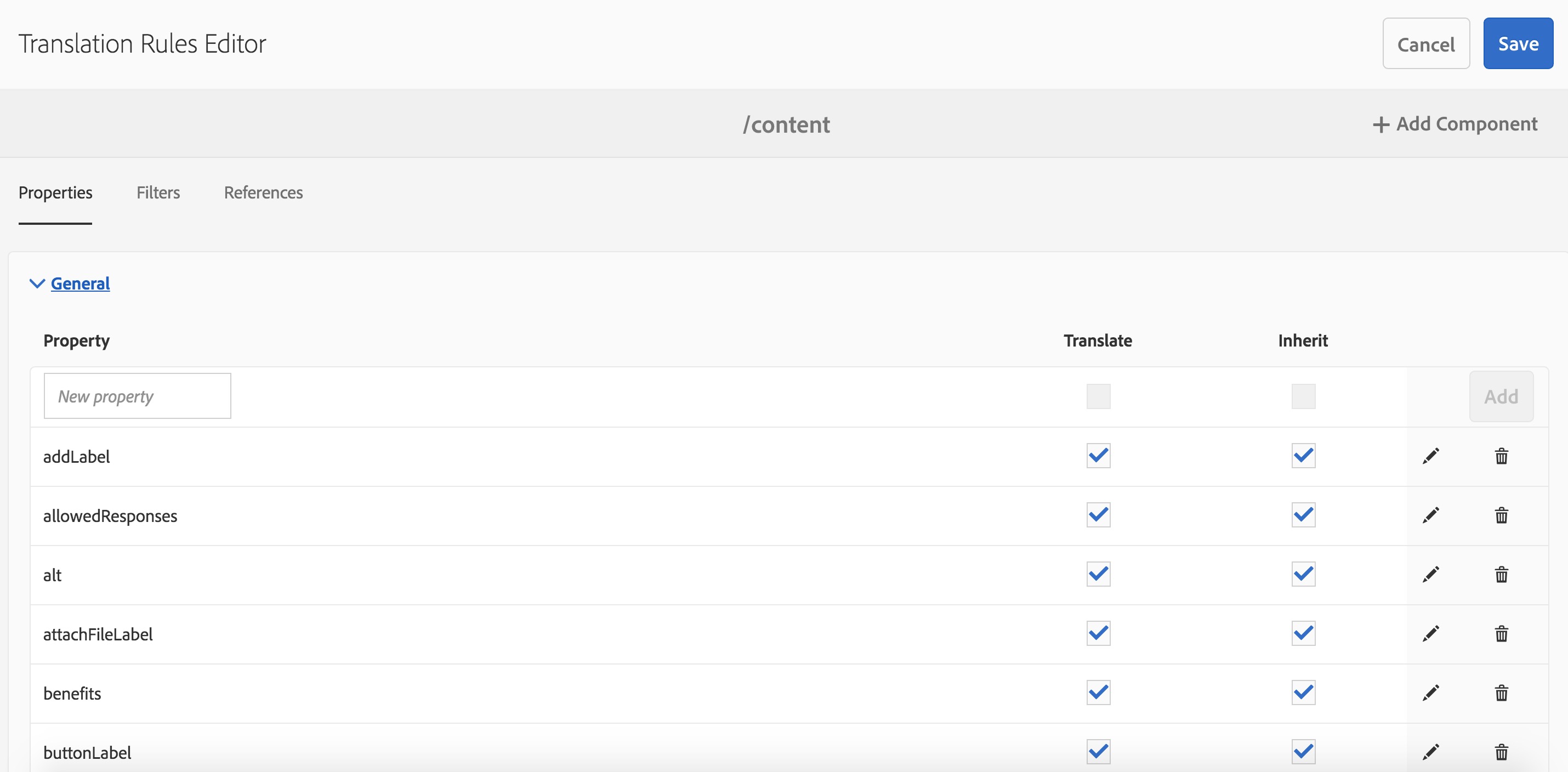 resourceType 속성에는 리소스 유형을 구현하는 구성 요소로 확인되는 경로가 포함됩니다.property 요소는 번역할 노드 속성을 식별합니다. 이 노드를 노드 규칙에 대해 하위 property 요소와 동일한 방식으로 사용하십시오.다음과 같은 예시 규칙을 사용하면 모든 text 속성의 콘텐츠가 /content 노드 아래의 모든 페이지에 대해 번역됩니다. 이 규칙은 컨텐츠를 text 기본 텍스트 구성 요소 및 기초 이미지 구성 요소와 같은 속성.