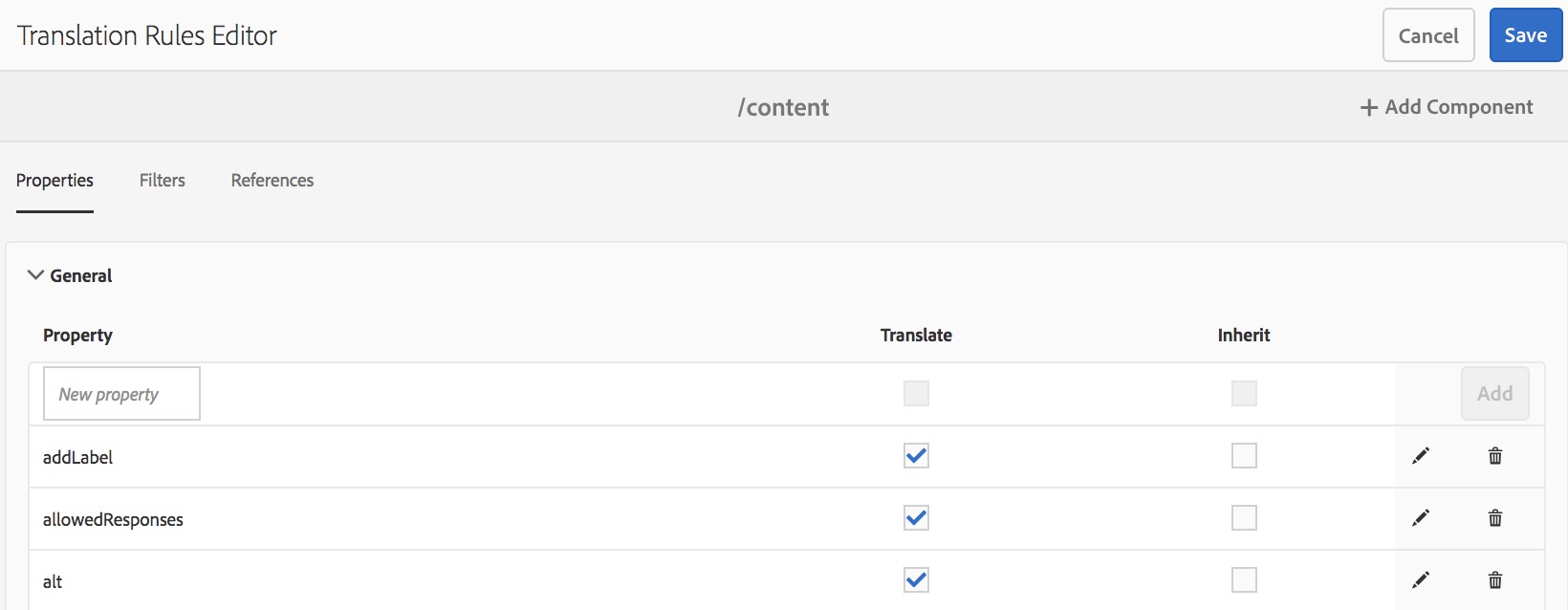随AEM一起安装的translation_rules.xml文件包含一组默认的翻译规则。 您可以编辑该文件以支持翻译项目的要求。例如,您可以添加规则以翻译自定义组件的内容。
