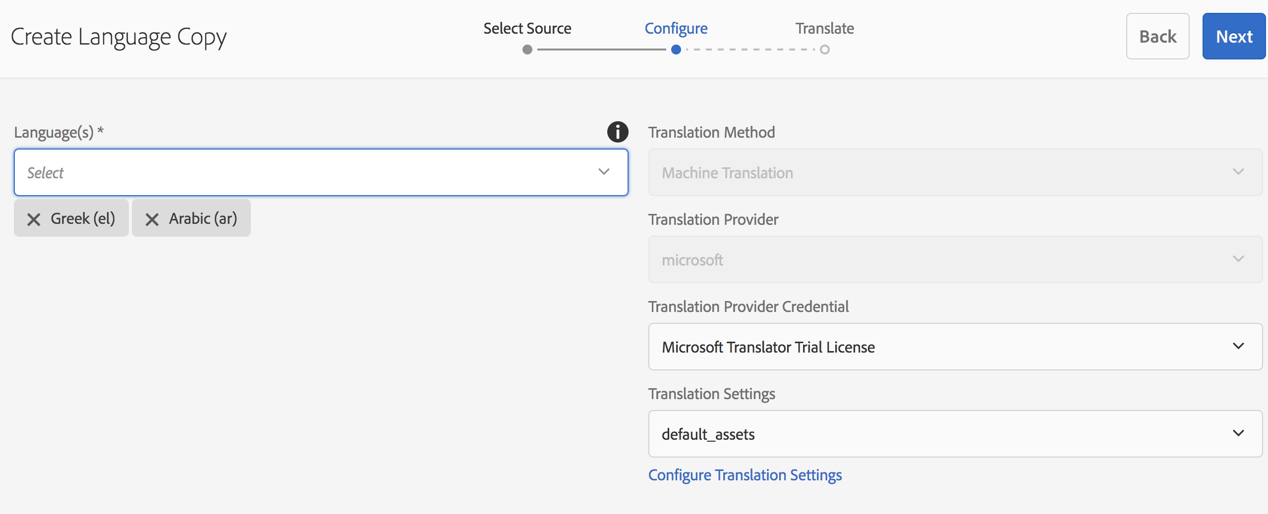 4. The Next button brings you to the Configure step of the wizard. Here you can add/remove languages and select translation method.