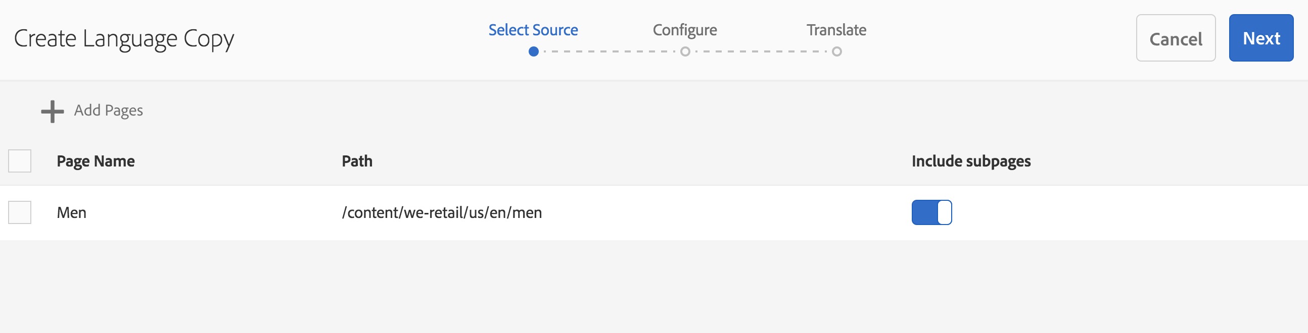 通过向导的 选择Source 步骤,您可以添加/删除页面。 您还可以选择包含或排除子页面。
