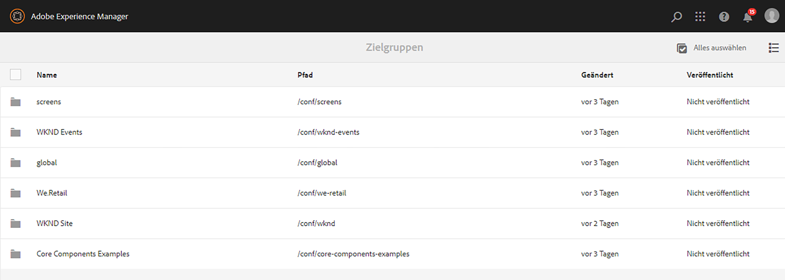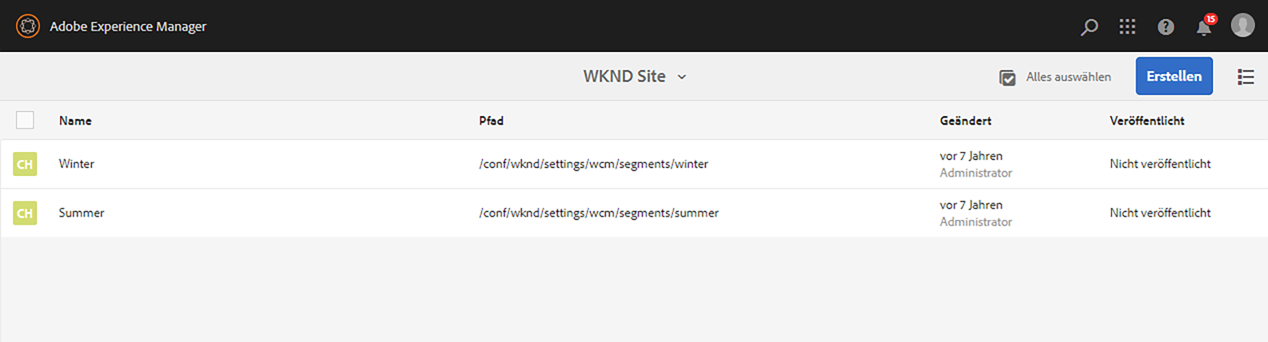 Wählen Sie Ihre Konfiguration aus, um die Segmente anzuzeigen, z. B. die WKND-Site: