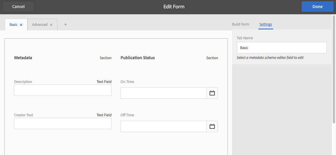 É possível editar um formulário de esquema de metadados recém-adicionado ou existente, que inclui o seguinte: