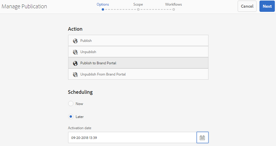 A continuación, desde Acción, seleccione Publish a Brand Portal y desde Programación, seleccione Ahora. Haga clic en Siguiente.