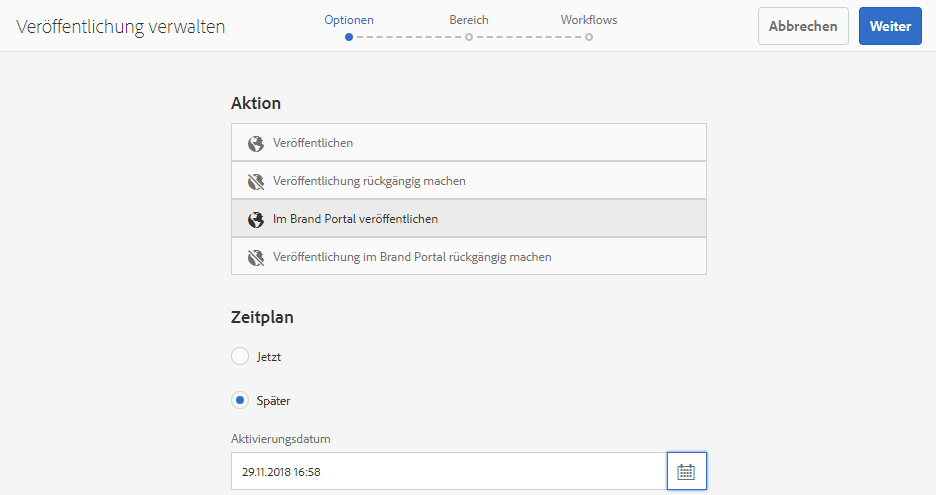 Wählen Sie in Aktion die Option In Brand Portal veröffentlichen aus und wählen Sie in Zeitplan die Option Später aus.