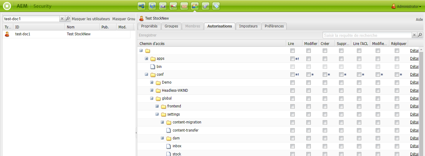 readpour la configuration cloud d’Adobe Stock :/conf/global/settings/stock.note caution CAUTION Si la configuration cloud n’est pas autorisée, l’utilisateur peut uniquement accéder aux Ressources dans l’interface d’Experience Manager. Pour autoriser l’accès aux Ressources et aux ressources d’Adobe Stock, assurez-vous que la configuration cloud est autorisée pour l’utilisateur. -