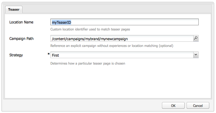 AEM에 타겟 구성 요소 옵션 창이 표시됩니다.