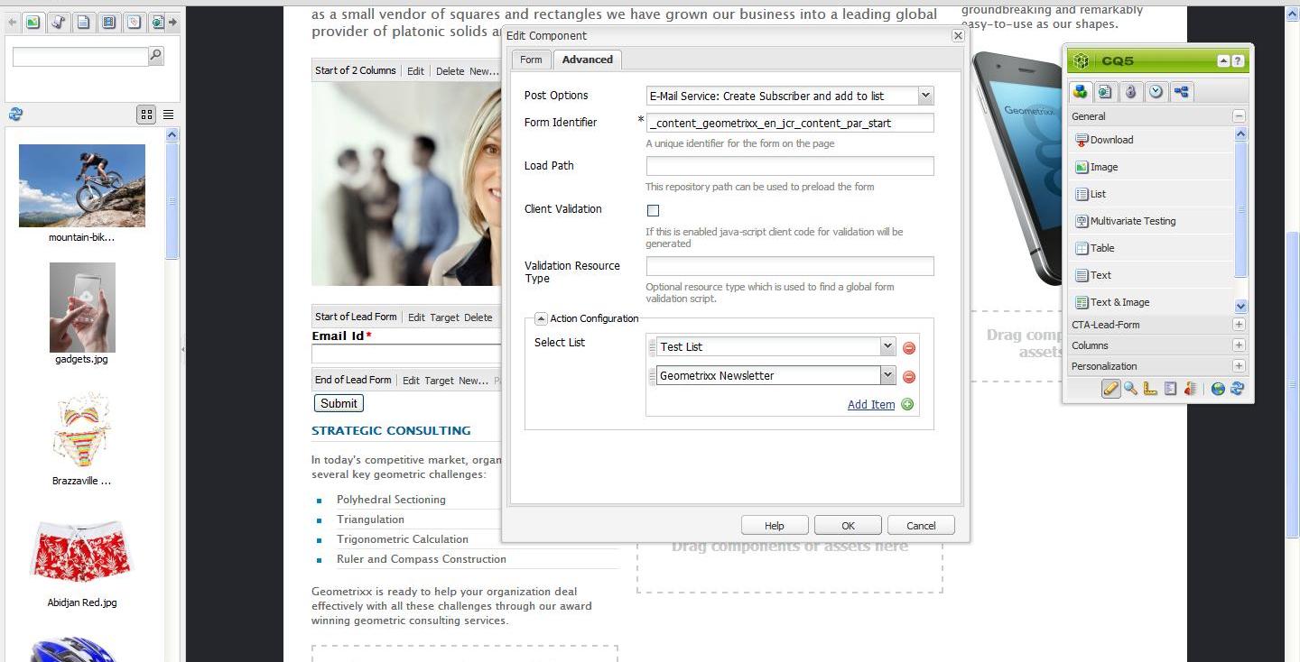 Na guia Formulário, selecione a página de agradecimento que os usuários devem acessar depois que enviarem o formulário (Se permanecer em branco, o formulário será exibido novamente após o envio). Clique em OK. Um componente de ID de email aparece no Formulário, que permite criar um formulário no qual os usuários podem enviar seus endereços de email para se inscreverem ou cancelar a inscrição de uma lista de endereçamento.