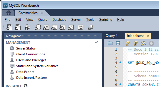 MySQL Workbench bietet eine Benutzeroberfläche zum Ausführen von SQL-Skripts, die das Schema und die Anfangsdaten installieren.