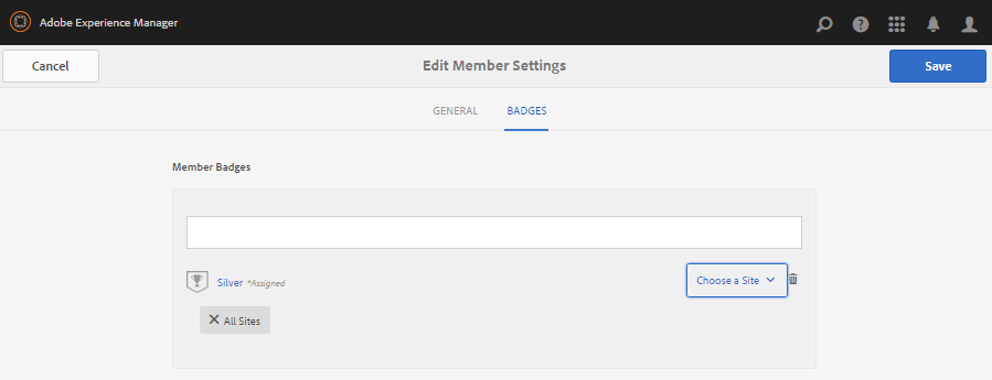 - Empiece a escribir para seleccionar entre insignias disponibles. Una vez seleccionado un distintivo, elija cada sitio, o todos los sitios, en los que el distintivo debe mostrarse junto con el avatar del miembro.