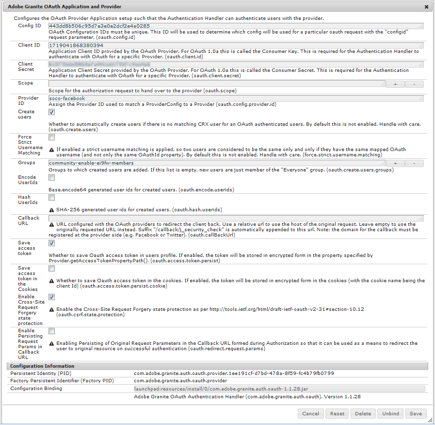 facebookまたはTwitter用の Cloud Service を作成すると、Adobe Granite OAuth Authentication Handler のインスタンスが作成されます。