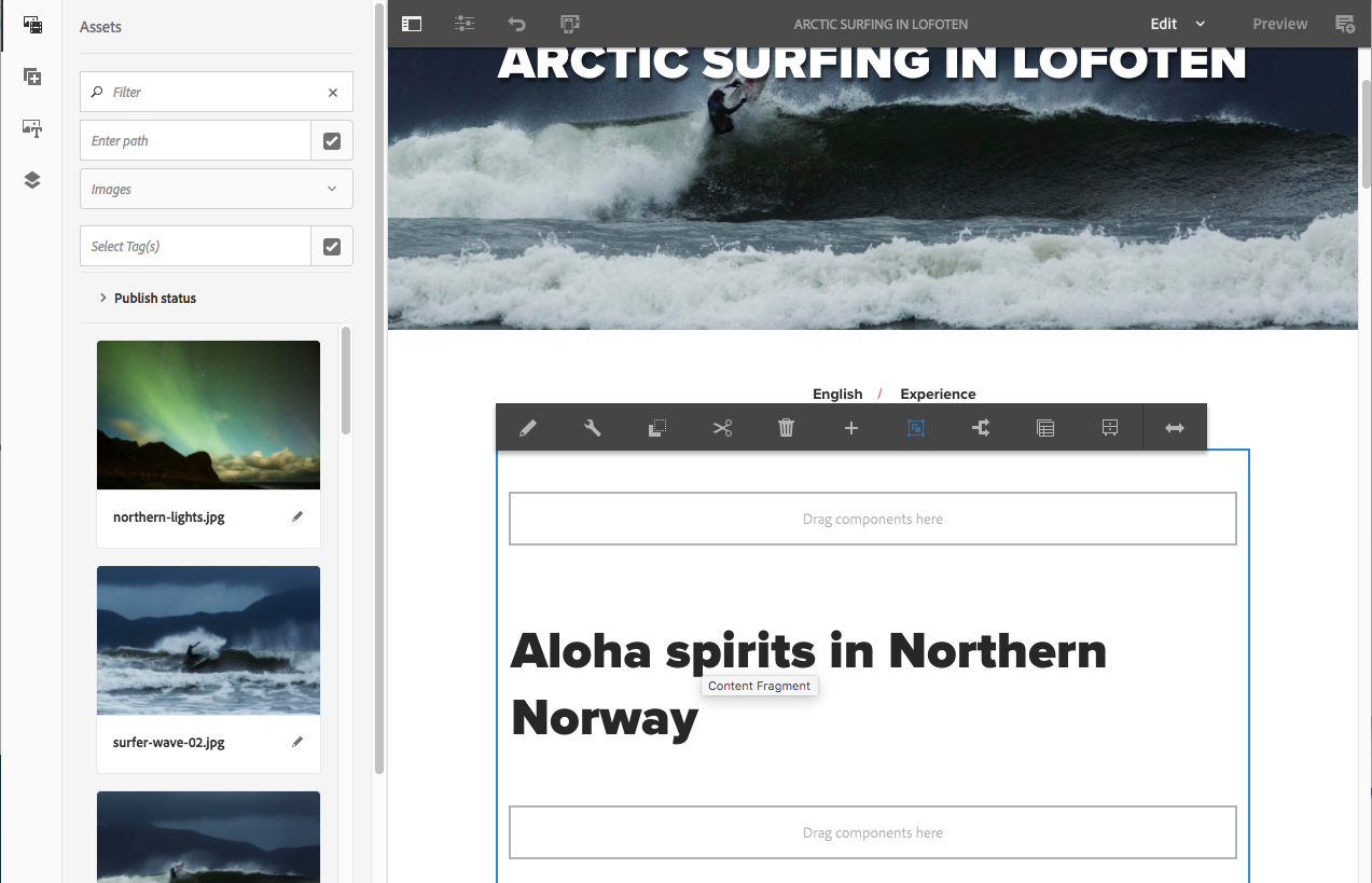 透過 網站、We.Retail、語言主版、英文、體驗 進行瀏覽。 接著在Lofoten 開啟 Arctic Surfing進行編輯:
