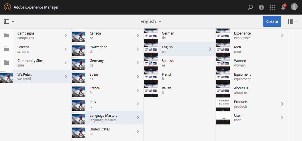 Alterne para a exibição de coluna (se ainda não estiver ativa) e selecione We.Retail. Observe o exemplo de estrutura de país com Suíça, Estados Unidos, França e assim por diante, ao lado do Idioma principal.