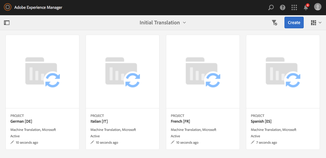 Ett projekt skapas för varje språköversättning. Visa dem under Navigering > Projekt.