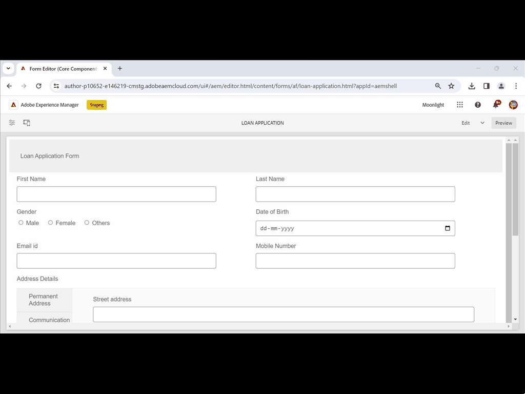 スキーマベースのフォームフラグメントをアダプティブフォームで複数回使用して、各フォームフラグメントフィールドのデータを一意に保存できます。例えば、住所フォームフラグメントを使用して、ローン申し込みフォームの本住所、連絡先住所、および現居住住所に関する詳細な住所を収集できます。