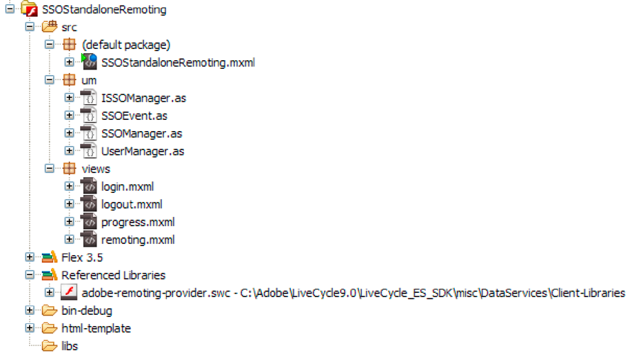 SSOStandalone.mxml:代表使用者端應用程式的主要MXML檔案。 (請參閱建立SSOStandalone.mxml檔案。)um/ISSOManager.as:公開與單一登入(SSO)相關的作業。 (請參閱建立ISSOManager.as檔案。)um/SSOEvent.as:SSOEvent已針對SSO相關事件進行分派。 (請參閱建立SSOEvent.as檔案。)um/SSOManager.as:管理SSO相關作業並分派適當的事件。 (請參閱建立SSOManager.as檔案。)um/UserManager.as:包含使用其WSDL叫用Authentication Manager服務的應用程式邏輯。 (請參閱建立UserManager.as檔案。)views/login.mxml:代表登入畫面。 (請參閱建立login.mxml檔案。)views/logout.mxml:代表登出畫面。 (請參閱建立logout.mxml檔案。)views/progress.mxml:代表進度檢視。 (請參閱建立progress.mxml檔案。)views/remoting.mxml:代表使用遠端功能叫用名為MyApplication/EncryptDocument之AEM Forms短期處理程式的檢視。 (請參閱建立remoting.mxml檔案。)