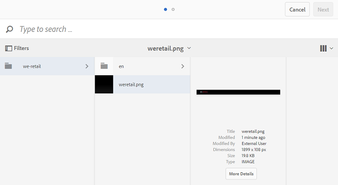- Para usar uma imagem existente do Brand Portal, clique em Selecionar de existente. Escolha uma imagem usando o seletor de ativos.
