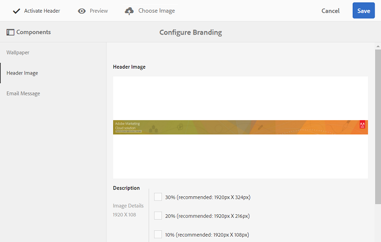Para personalizar o cabeçalho da página para a interface do Brand Portal, na página Configurar Identidade Visual, selecione Imagem do Cabeçalho no painel esquerdo. A imagem do cabeçalho padrão é exibida.